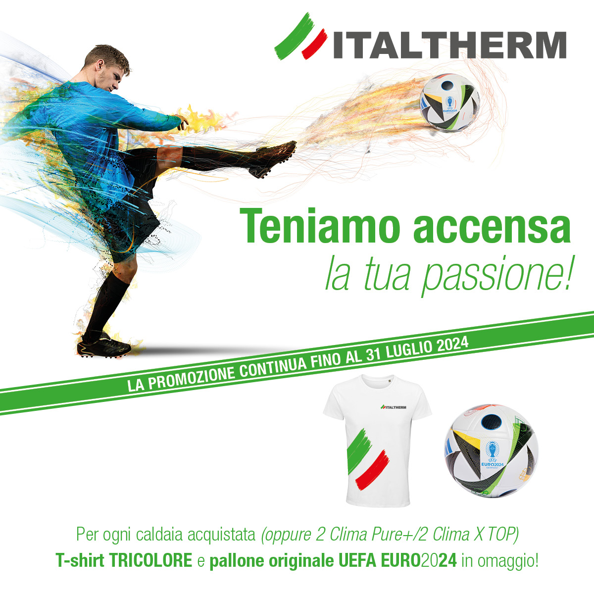 C’è tempo fino al 31 luglio ’24 per richiedere un pallone originale UEFA EURO 24 e una t-shirt tricolore, per ogni caldaia (o 2 Clima Pure+/2 Clima X TOP) acquistata.