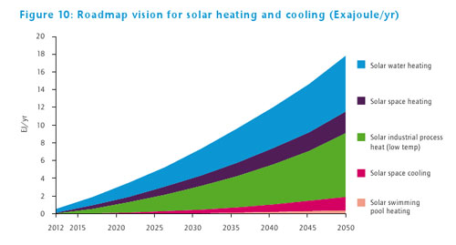 Mentre adesso il contributo totale dell’energia termica solare è ancora modesto a causa di una scarsa diffusione, la previsione per il futuro è di un deciso aumento: secondo il nuovo Technology Roadmap – Solar Heating and Cooling dell’International Energy Agency, il contributo del solare termico al 2050 potrebbe essere di ben un sesto dell’energia necessaria per riscaldamento e raffrescamento, corrispondenti a oltre 4.500 Twh termici. In particolare per gli usi nell’edilizia, i collettori solari per la produzione di acqua calda sanitaria potrebbero raggiungere 3.500 GW termici al 2050, corrispondenti al 14% degli usi finali di riscaldamento edilizio, mentre la stima totale nel mix energetico finale per riscaldamento è del 16% e del 17% per raffrescamento: cifre molto importanti, soprattutto se si considera che la domanda globale di calore rappresenta quasi la metà degli usi finali di energia – più dei trasporti e dell’elettricità messi insieme. Questo permetterebbe di tagliare 800 Mt di emissioni di CO2 ogni anno, ovvero quasi il doppio delle emissioni annuali dell’Italia. Per cui, conclude la IEA, “il solare termico può dare un contributo significativo sia nella lotta ai cambiamenti climatici, che nella sicurezza energetica”.