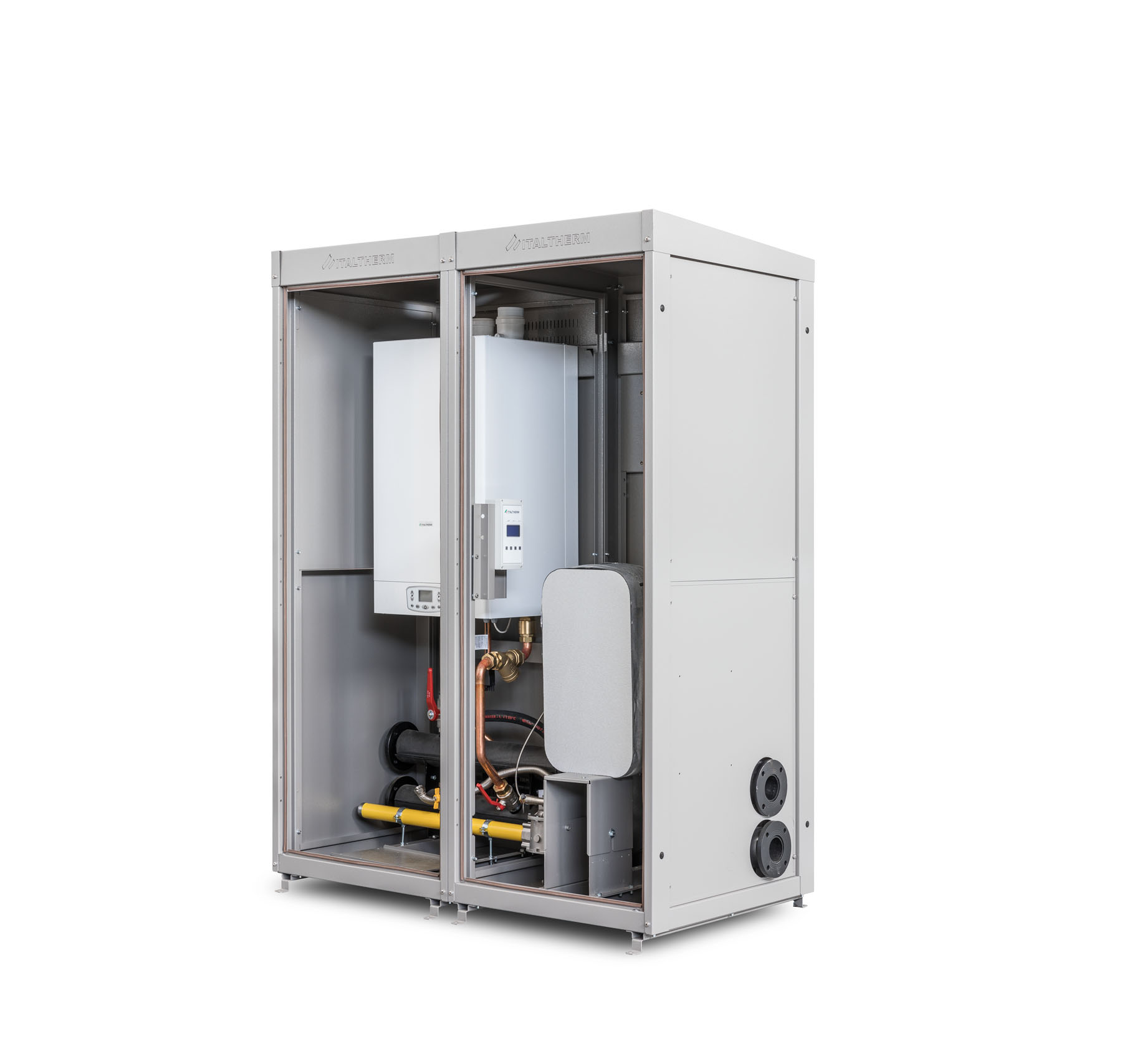 Disponiamo di una gamma completa di questi apparecchi per soddisfare le diverse esigenze. Si parte dalle caldaie murali da interno, sia con disposizione in linea che con telaio autoportante per installazioni fronte/retro al centro del locale tecnico. Si passa poi ai modelli a basamento, ultima novità di Italtherm, che si caratterizzano per le dimensioni molto compatte (hanno una larghezza di soli 55 cm), e per una struttura che agevola la configurazione in cascata in quanto i collettori idraulici e gas sono montati all’interno dell’apparecchio. Le caldaie da interno possono essere alloggiate in box modulari studiati ad hoc per installazione singola o in cascata, nel caso servisse un’applicazione all’esterno dell’edificio.