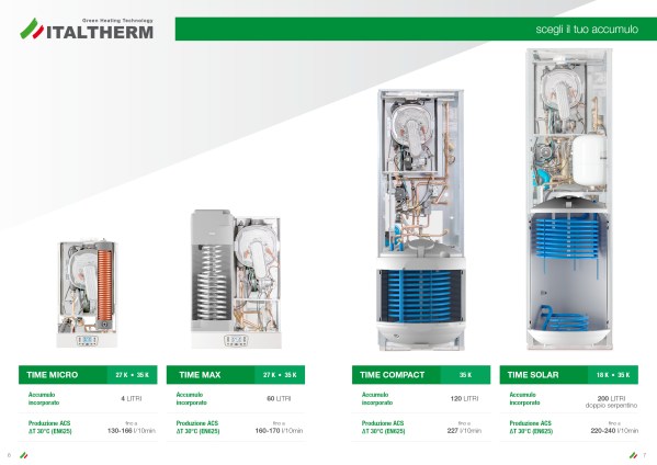 Time Micro fa parte della gamma di caldaie a condensazione con modulazione 1:10 e con accumulo integrato, con soluzioni che vanno dai 4 ai 200 litri: presente infatti anche la caldaia a condensazione murale Time Max con accumulo da 60 litri, e le caldaie a basamento Time Compact, con accumulo integrato da 120 litri e Time Solar, con gruppo solare integrato, il cui accumulo arriva a 200 litri.